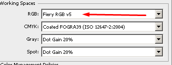- Печать производится напрямую из RGB цветовой модели без цветокоррекции на этапе подготовки файлов. В качестве входного цветового профиля используется профиль Fiery RGB v5. (профиль оптимизирован под печатную машину, по цветоохвату чуть шире SRGB, более гладко и чисто передает скинтон). Встроенные профиля (если имеются) отбрасываются.